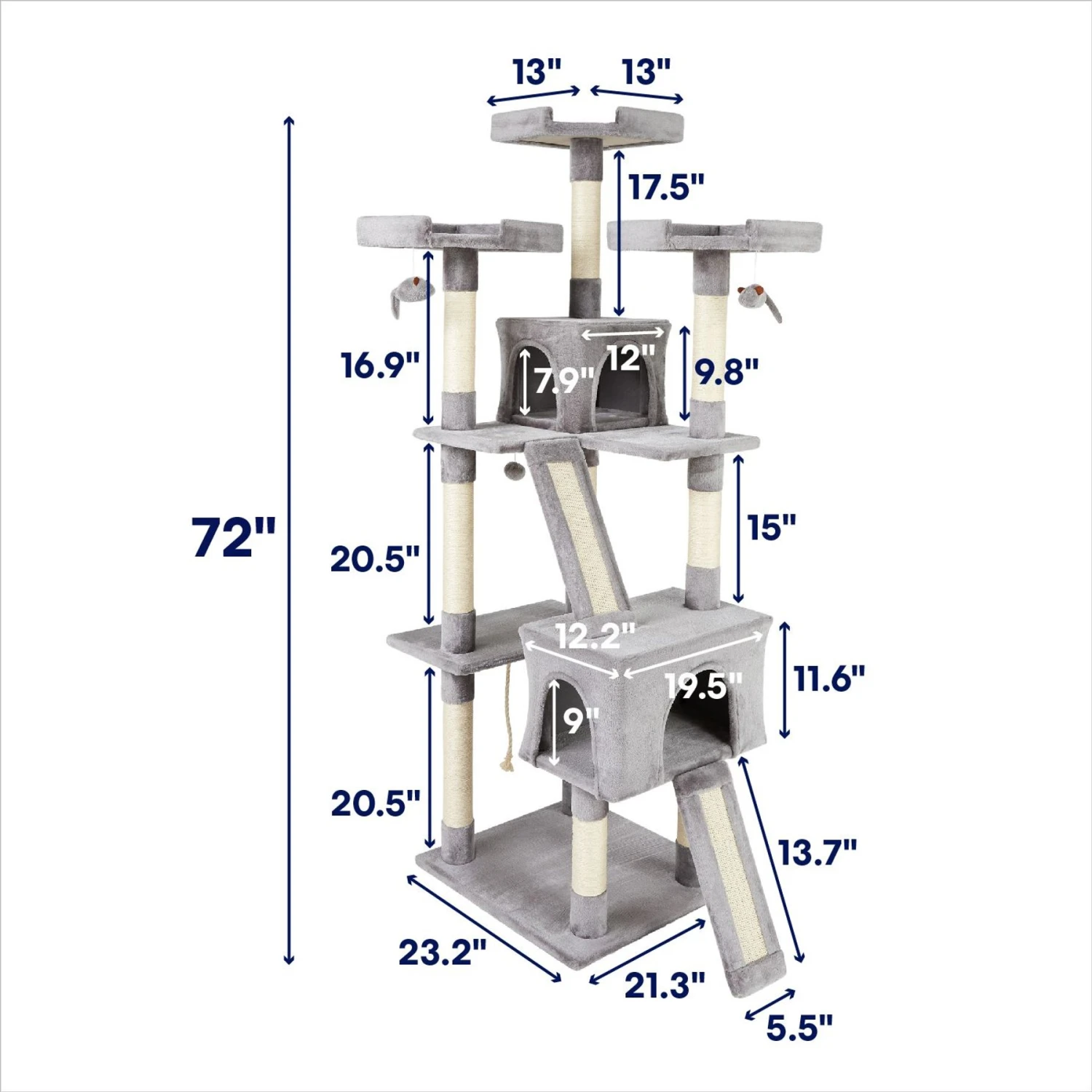 This 72-inch cat tree, from Frisco by Chewy, is the ultimate all-in-one spot for your kitty to do all the things they love, from lounging to leaping to honing their expert hunting skills. Frisky cats can jump from perch to perch and climb to the top of the lookout tower. Carefully placed dangling toys give your cat the thrill of the hunt as they bat them around till their heart’s content. With 10 enticing scratching posts and two scratch board ramps, several cats can claw at once, so it’s great for multi-cat households. When it’s time for a catnap, two private kitty apartments provide quiet spots to curl up for snoozing. The soft, plush fabric covering makes naptime comfy, plus it’s great for face rubbing and nuzzling.